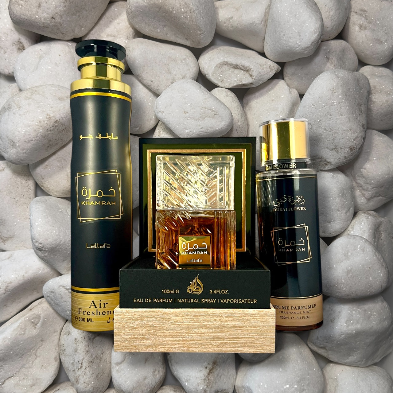 Khamrah est une fragrance orientale gourmande qui s'ouvre sur une combinaison épicée et fraîche de bergamote, de cannelle et de noix de muscade. Le cœur révèle une douceur sucrée avec des notes de dattes, de praliné et de tubéreuse, enrichies par l'accord floral de Mahonial. Le fond offre une profondeur chaleureuse et boisée grâce à la vanille, à la fève tonka grillée, à la myrrhe, au benjoin, au bois d'ambre et au bois d'akagila.