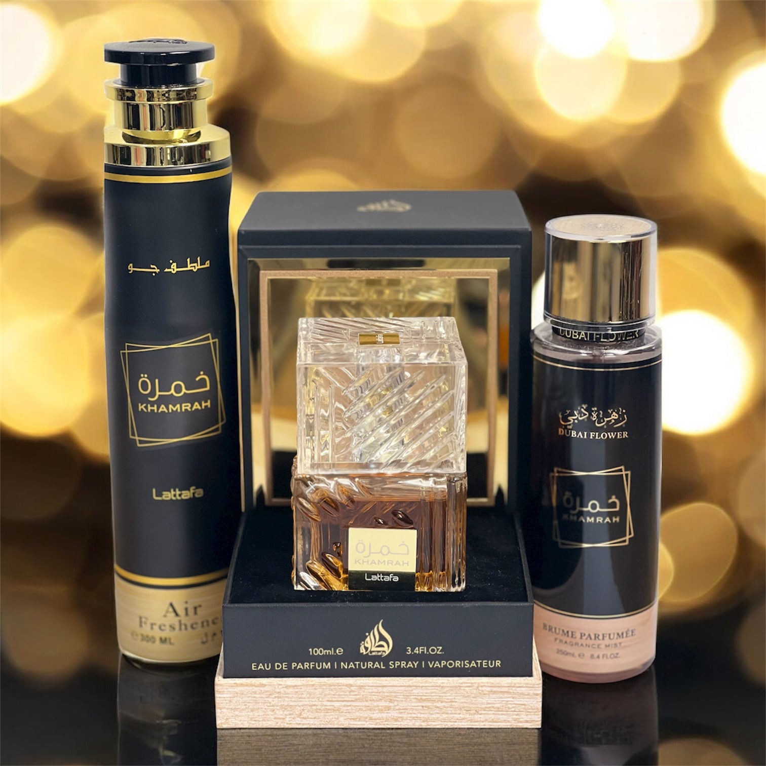 Khamrah est une fragrance orientale gourmande qui s'ouvre sur une combinaison épicée et fraîche de bergamote, de cannelle et de noix de muscade. Le cœur révèle une douceur sucrée avec des notes de dattes, de praliné et de tubéreuse, enrichies par l'accord floral de Mahonial. Le fond offre une profondeur chaleureuse et boisée grâce à la vanille, à la fève tonka grillée, à la myrrhe, au benjoin, au bois d'ambre et au bois d'akagila.