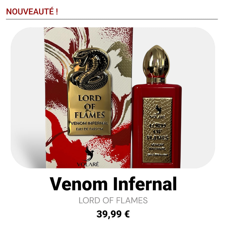 Venom Infernal de Volaré est une fragrance envoûtante où la gourmandise rencontre la puissance. L’ouverture mêle mûre, fraise et caramel pour une touche sucrée et addictive. En cœur, la cannelle et le cèdre de Virginie apportent chaleur et élégance, avant de s’épanouir sur un fond sensuel de fève tonka, vanille noire, patchouli et cuir russe. Un parfum oriental, fruité et cuiré, à la fois audacieux et magnétique, conçu pour ceux qui aiment laisser un sillage inoubliable.