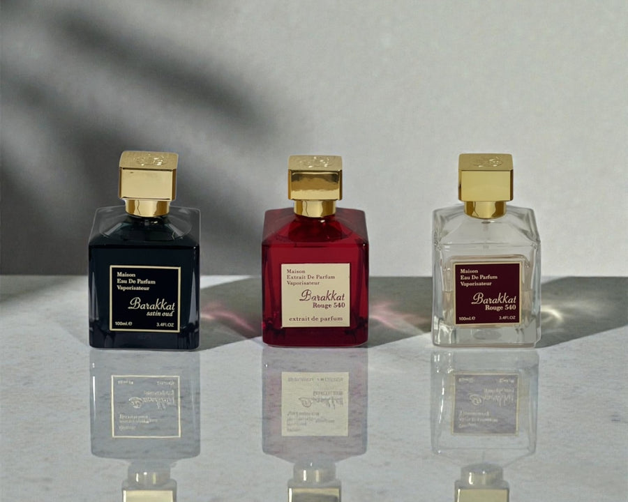 Barakkat Rouge Eau de Parfum offre une signature ambrée boisée plus lumineuse et équilibrée. Il est plus aérien, facile à porter et polyvalent, adapté à un usage quotidien.