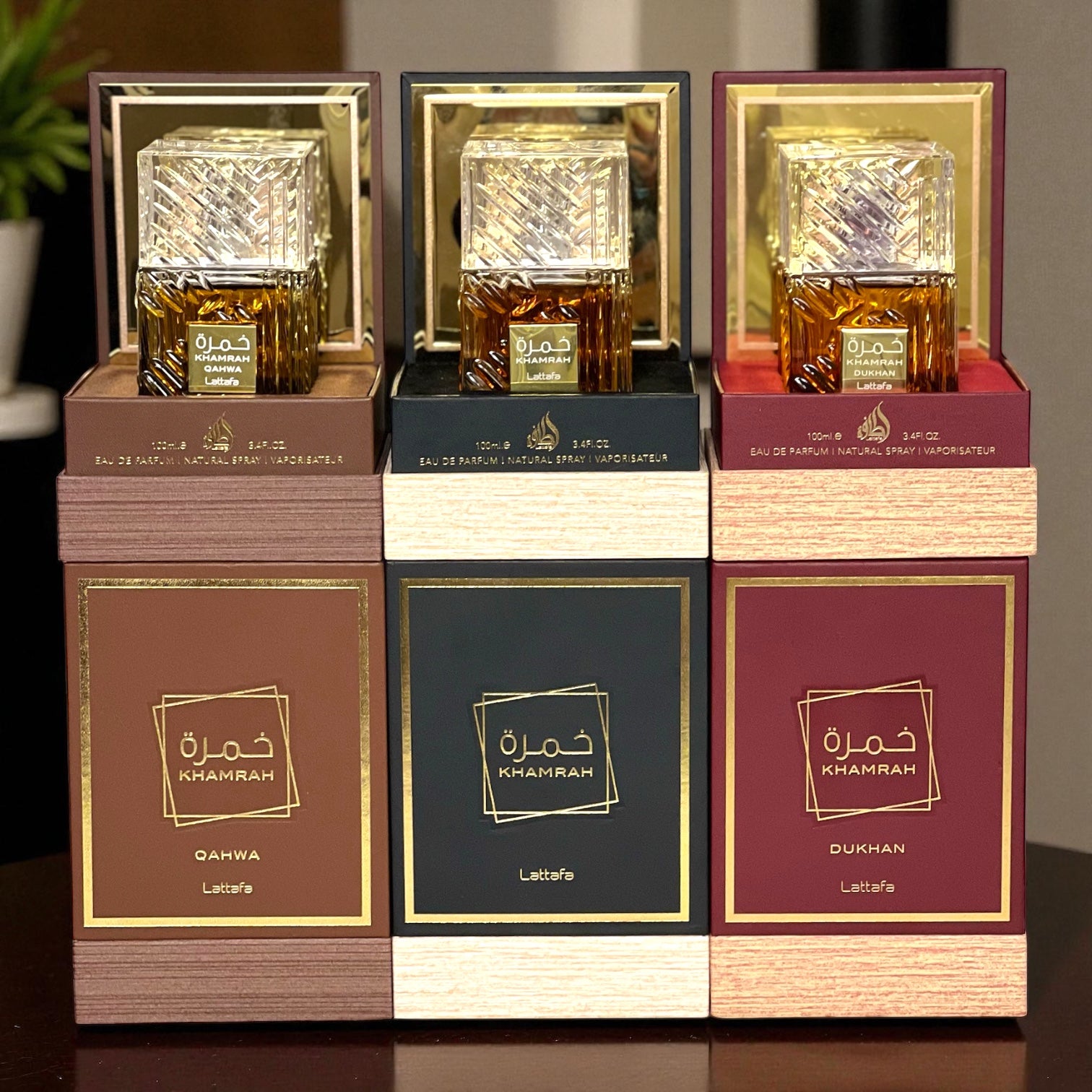 Khamrah est une fragrance orientale gourmande qui s'ouvre sur une combinaison épicée et fraîche de bergamote, de cannelle et de noix de muscade. Le cœur révèle une douceur sucrée avec des notes de dattes, de praliné et de tubéreuse, enrichies par l'accord floral de Mahonial. Le fond offre une profondeur chaleureuse et boisée grâce à la vanille, à la fève tonka grillée, à la myrrhe, au benjoin, au bois d'ambre et au bois d'akagila.