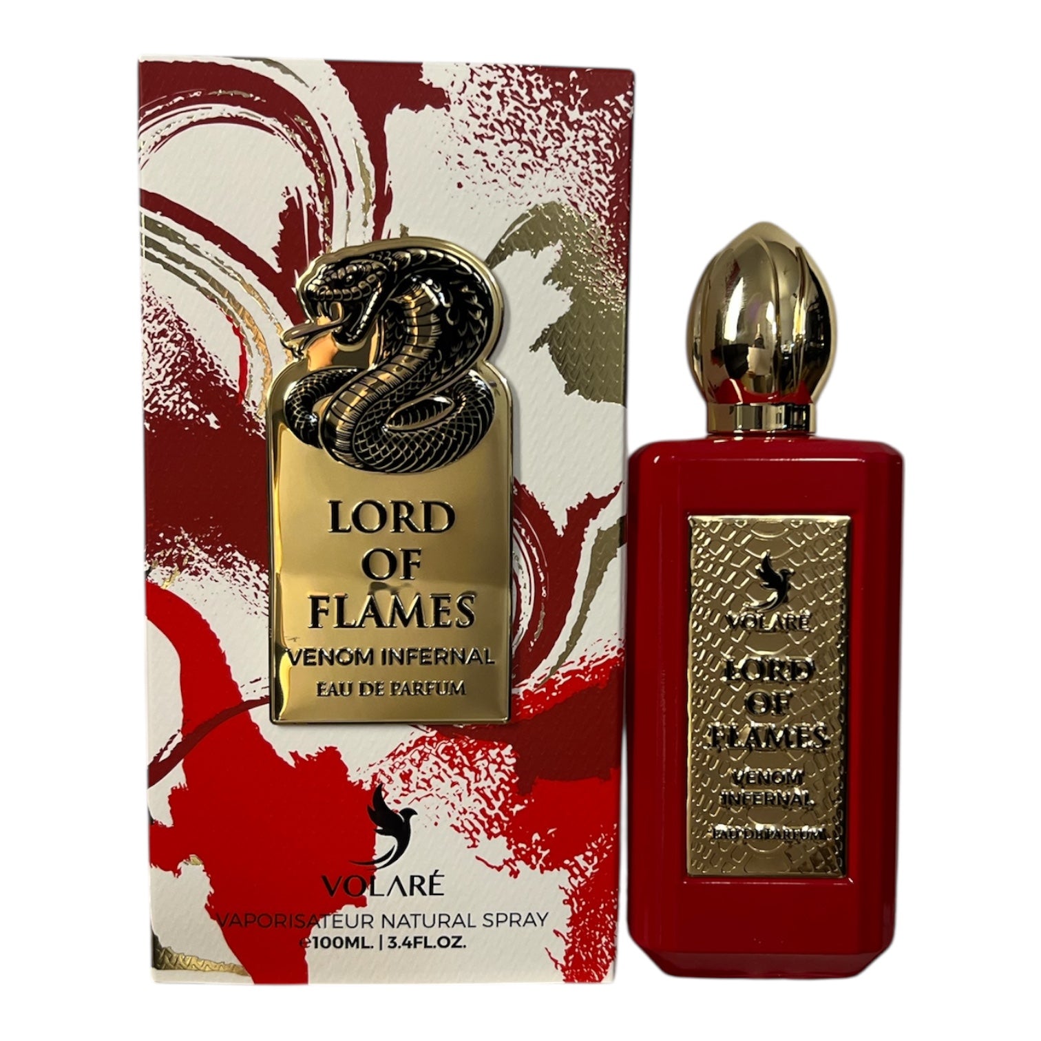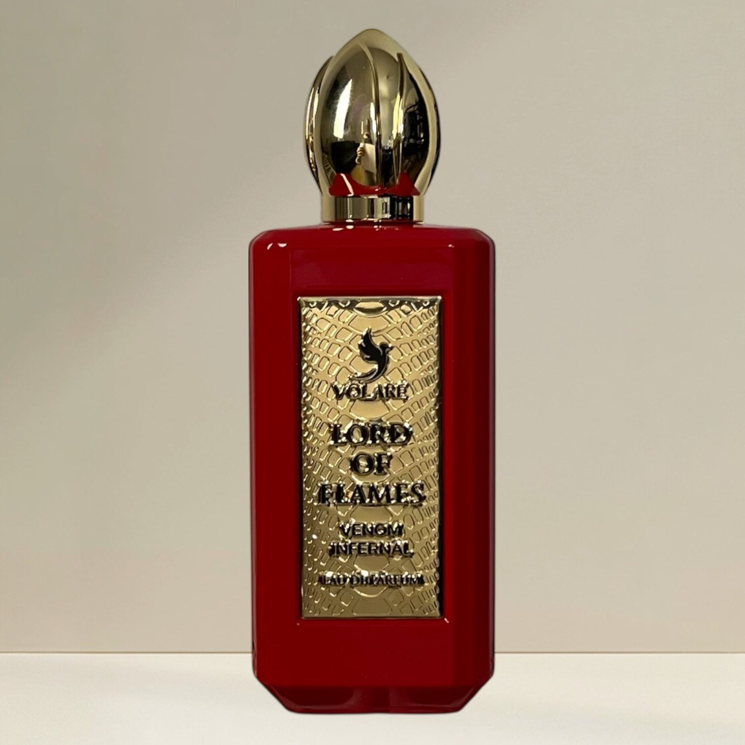 Volare Lord of Flames Of Venom Infernal est une fragrance audacieuse et séductrice : l’ouverture fruitée intense mêlant mûre, fraise des bois et caramel séduit immédiatement. Puis un cœur riche de framboise, cannelle et cèdre de Virginie s’installe. Enfin, la base profonde mélange fève tonka, vanille noire, patchouli et cuir russe pour un sillage enveloppant, sensuel et inoubliable. Idéal pour celles et ceux qui souhaitent affirmer une signature olfactive marquante.